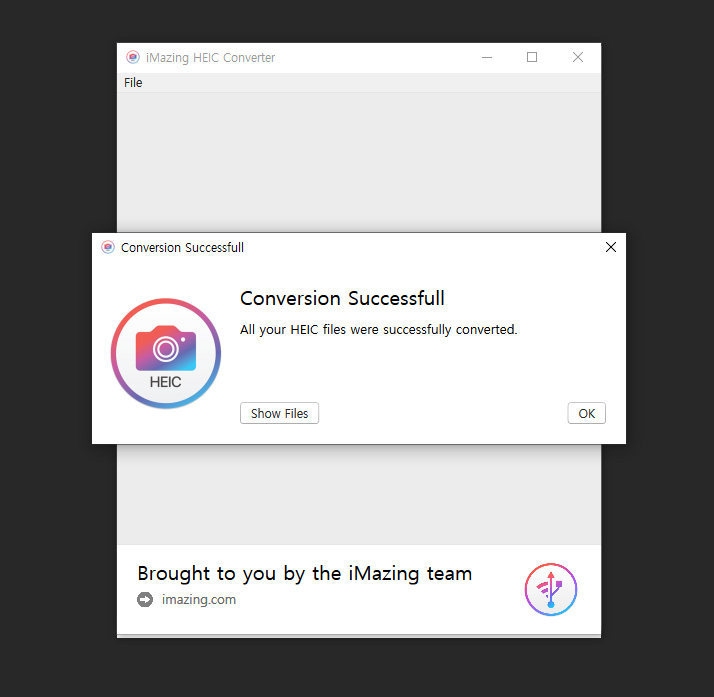- 설치한 iMazing을 실행시키고 변환할 HEIC 파일을 드래그하여 넣거나 오른쪽 상단의 File - Open Files...로 파일을 불러온다.